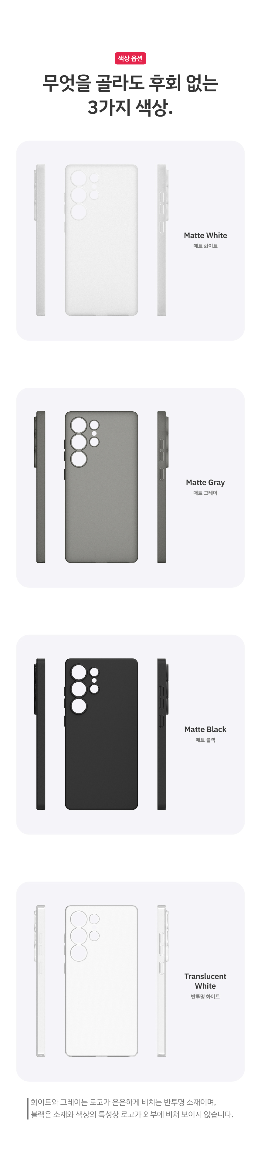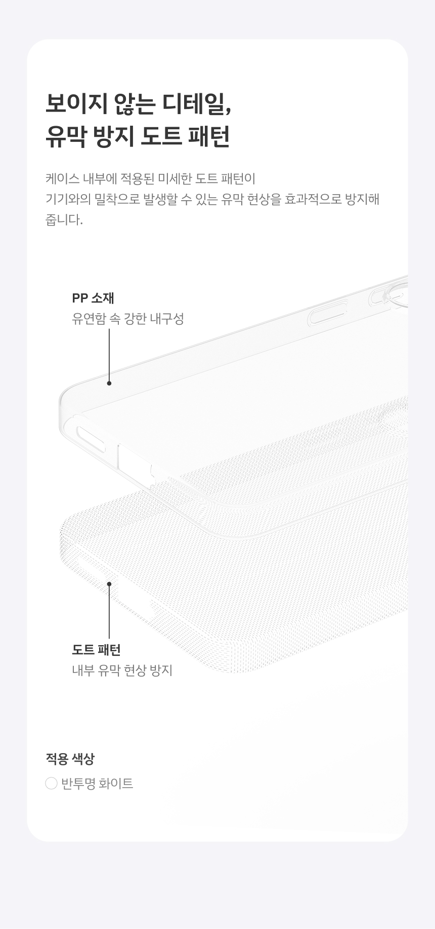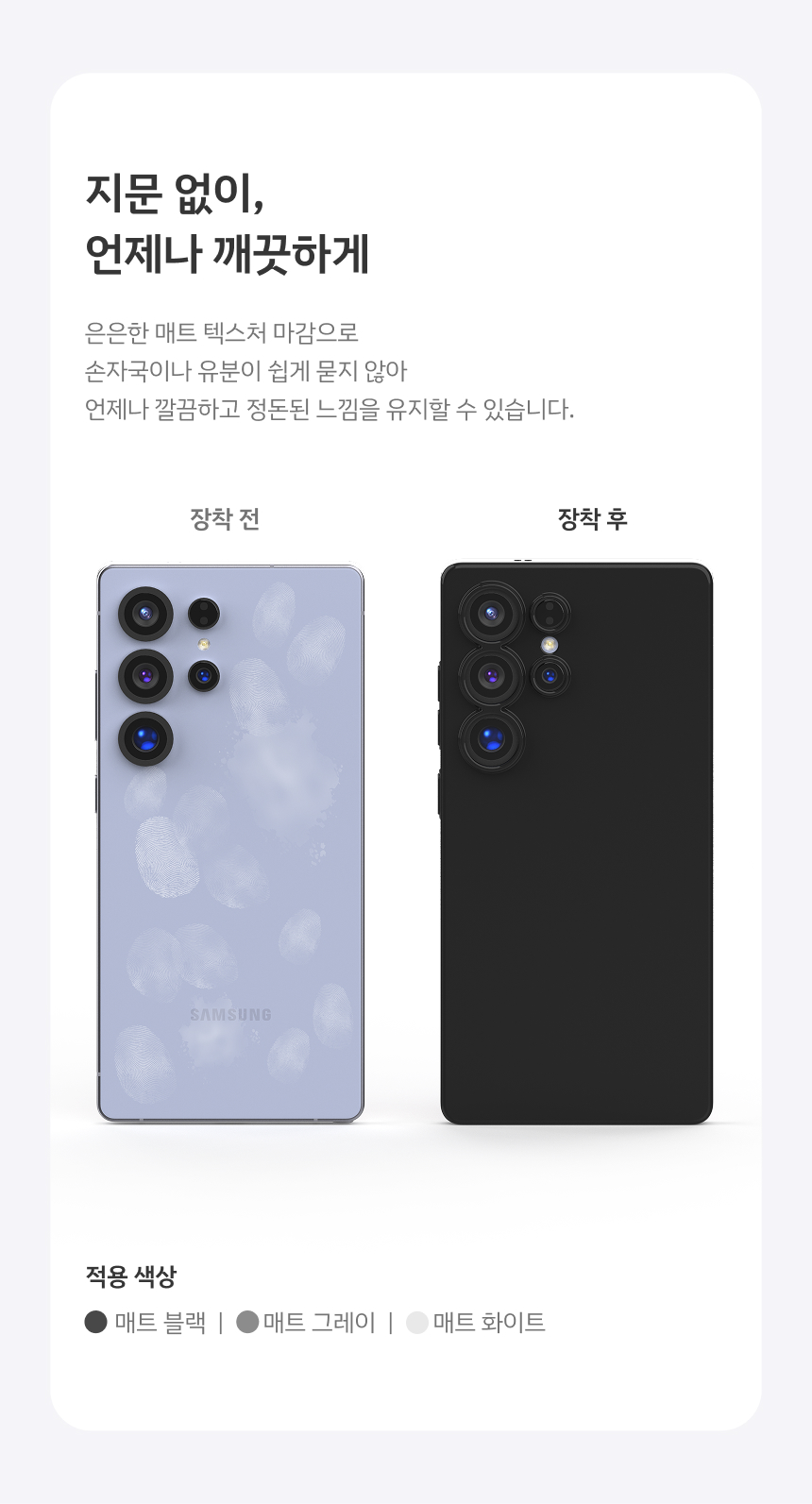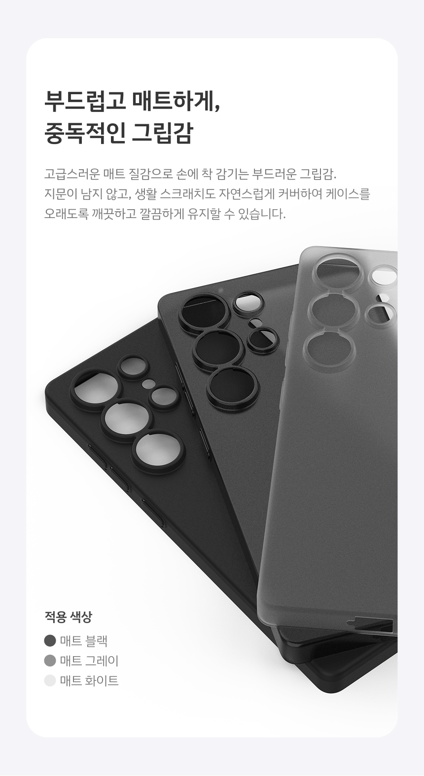 • 지문 방지: 고급스러운 매트 질감으로 부드러운 그립감과 깔끔한 지문방지 기능 제공