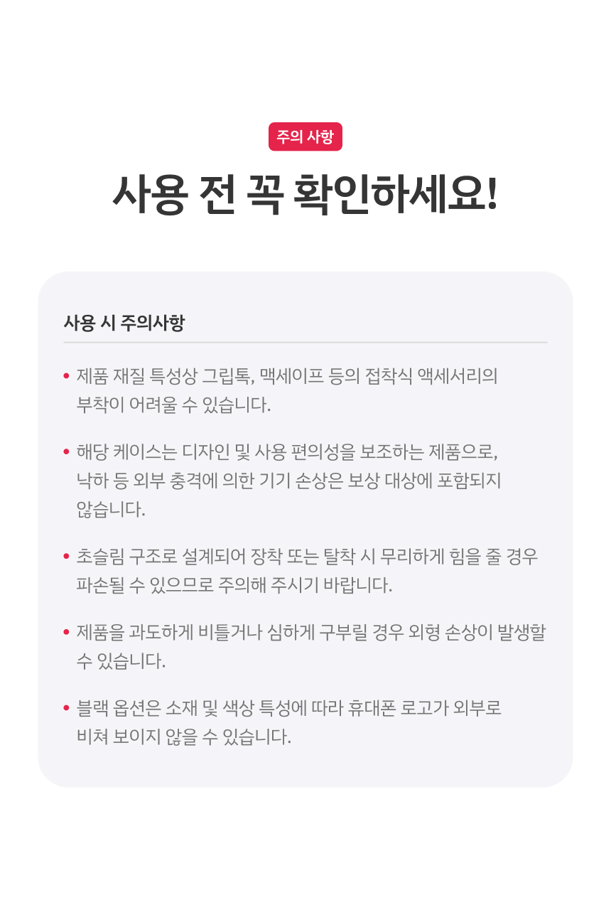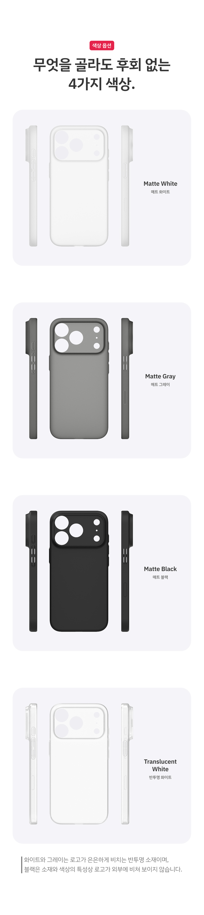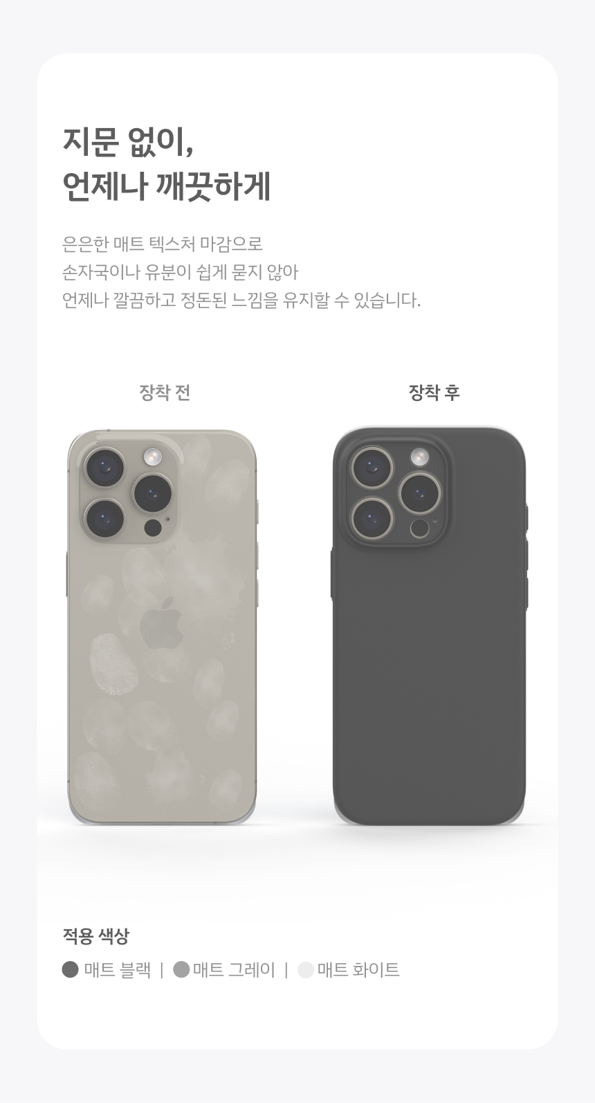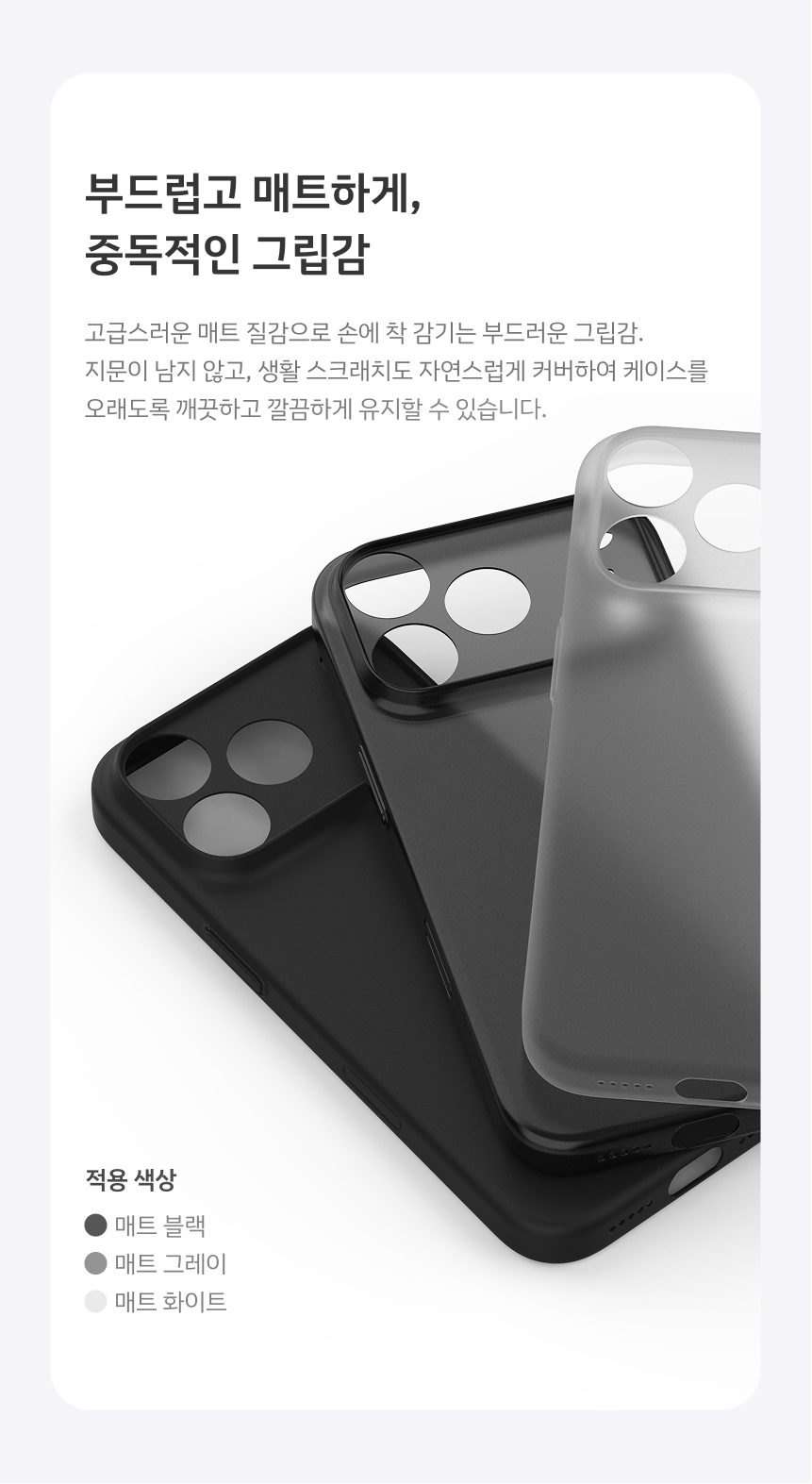 - 지문 방지: 고급스러운 매트 질감으로 부드러운 그립감과 깔끔한 지문방지 기능 제공