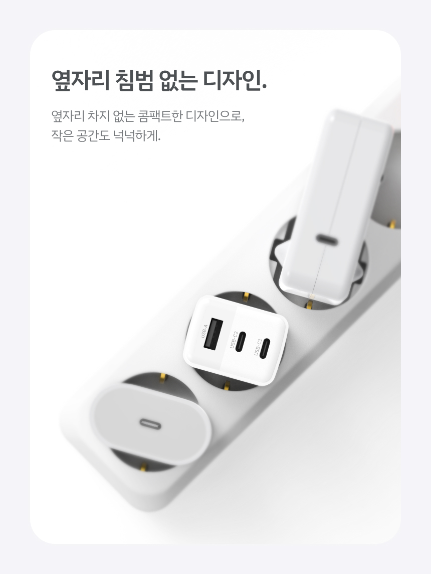 - 간섭 없는 슬림한 디자인으로 여러 콘센트에서도 깔끔하게 사용 가능