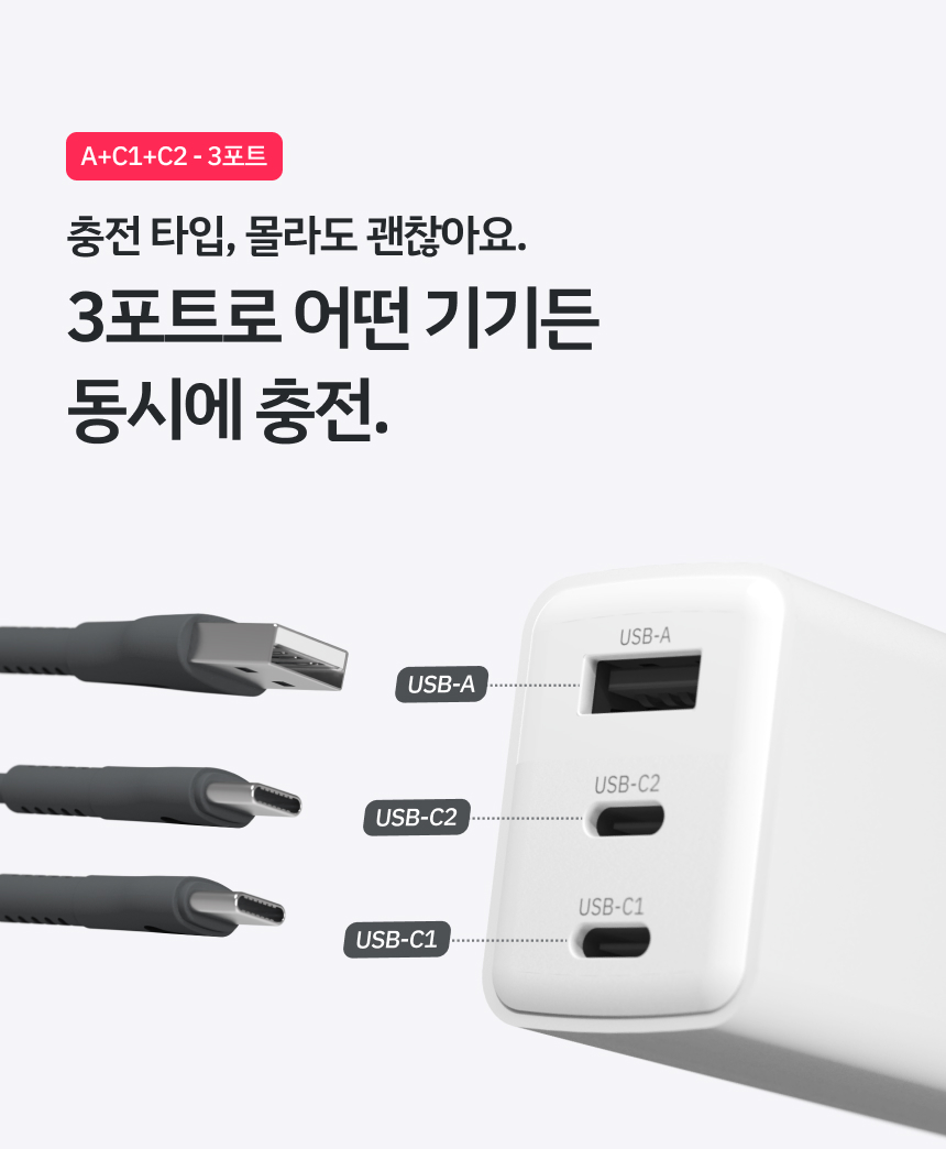 - 3가지 포트 동시 충전으로 USB-C와 A 포트로 두 기기를 동시에 충전 가능
