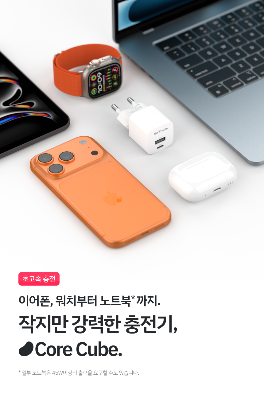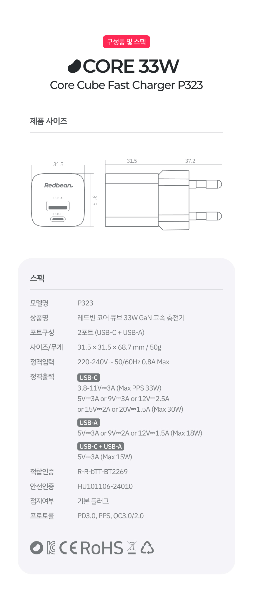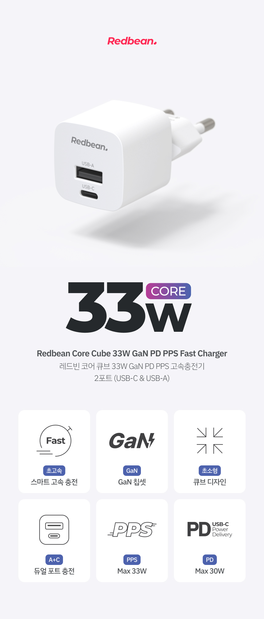 레드빈 코어큐브 33W GaN 초고속충전기 PD 아이폰 아이패드 고속충전기 RDP323